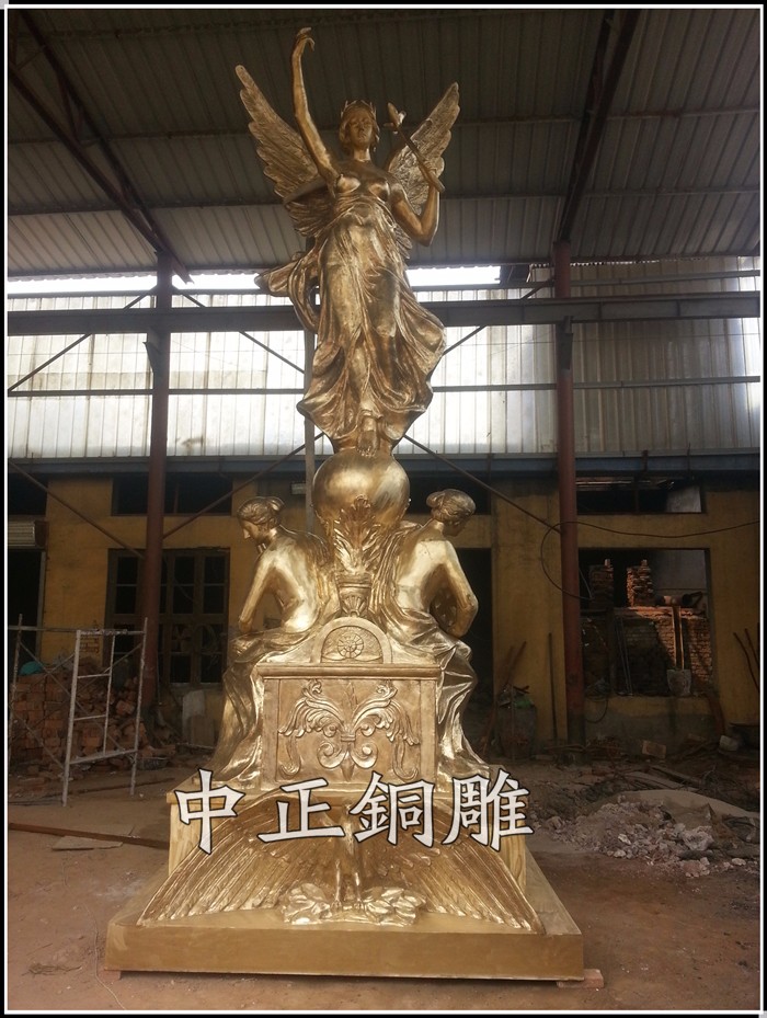 安裝于山東萊陽市山水華庭地產(chǎn),高6米女神銅雕塑,采用國標62黃銅制作,內(nèi)附鍍鋅骨架,表面效果為貼金效果,采用24K真金金箔,雕塑整體更顯高貴華麗。